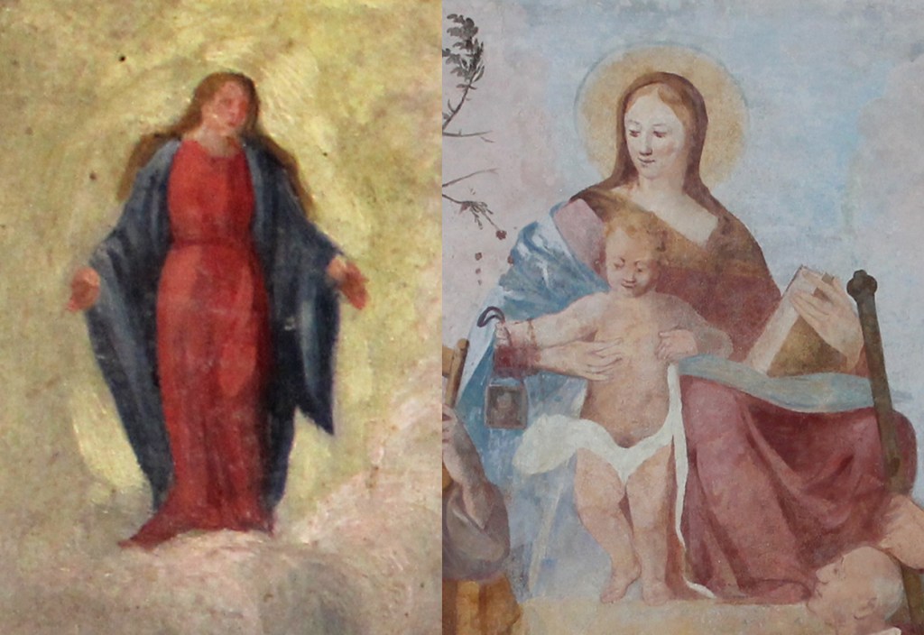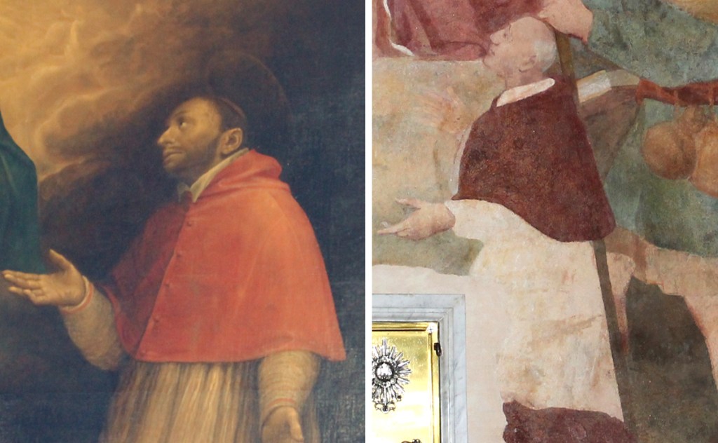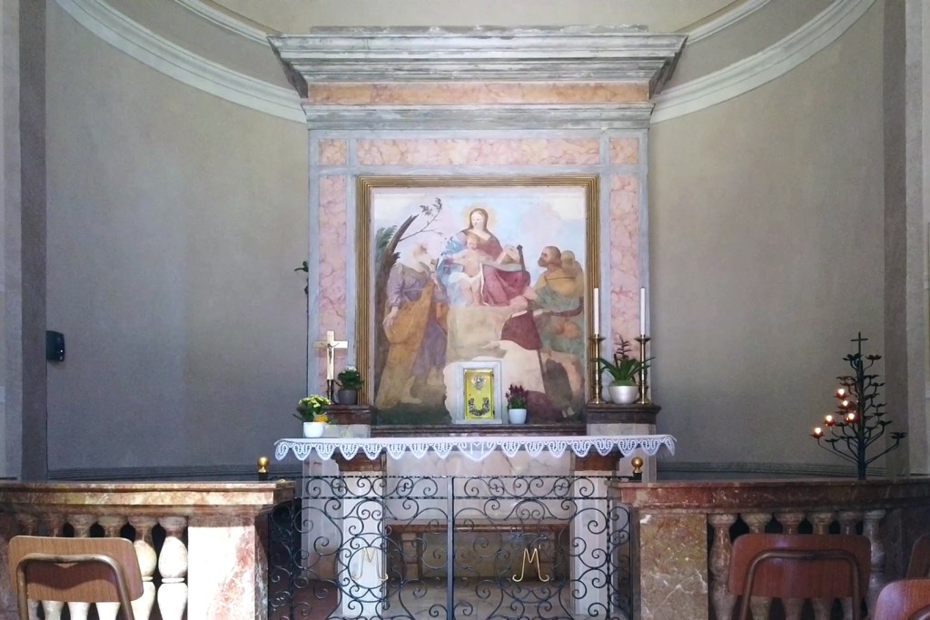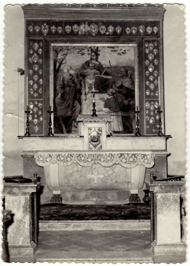 Il cartello segnaletico, posto all’esterno dell’Oratorio, non fa giustizia alla lungimiranza delle sorelle e forse meriterebbe di essere aggiornato, lanciamo un appello. Vediamo un po’: primo non è la Madonna, ma il Bambino ad offrire lo scapolare, e qui possiamo anche sorvolare. San Pietro è inconfondibile per le chiavi del paradiso che regge. Il santo sulla destra, non è tuttavia San Rocco, ma quel San Giacomo, titolare dell’antico Oratorio, lo riconosciamo per la conchiglia del pellegrino che porta sul cappello. Per il sacerdote inginocchiato, indicato come San Carlo, dobbiamo dire che assomiglia poco a quanto ci restituisce l’iconografia classica dell’alto prelato, ricordiamo fra le particolarità il naso prominente, che qui manca. Pensiamo che la figura proposta possa essere stato un omaggio delle sorelle ad uno zio, fratello del padre Francesco, che era appunto un sacerdote. Giusto per finire di fare le pulci al cartello aggiungiamo che l’Oratorio fu donato alla parrocchia nel 1957 mentre il 1963 indicato dalla scritta è l’anno in cui la donatrice, Giuseppina Borghi Belgir, muore. Abbiamo ancora tempo per confermare come la potenza divina non abbia confini.