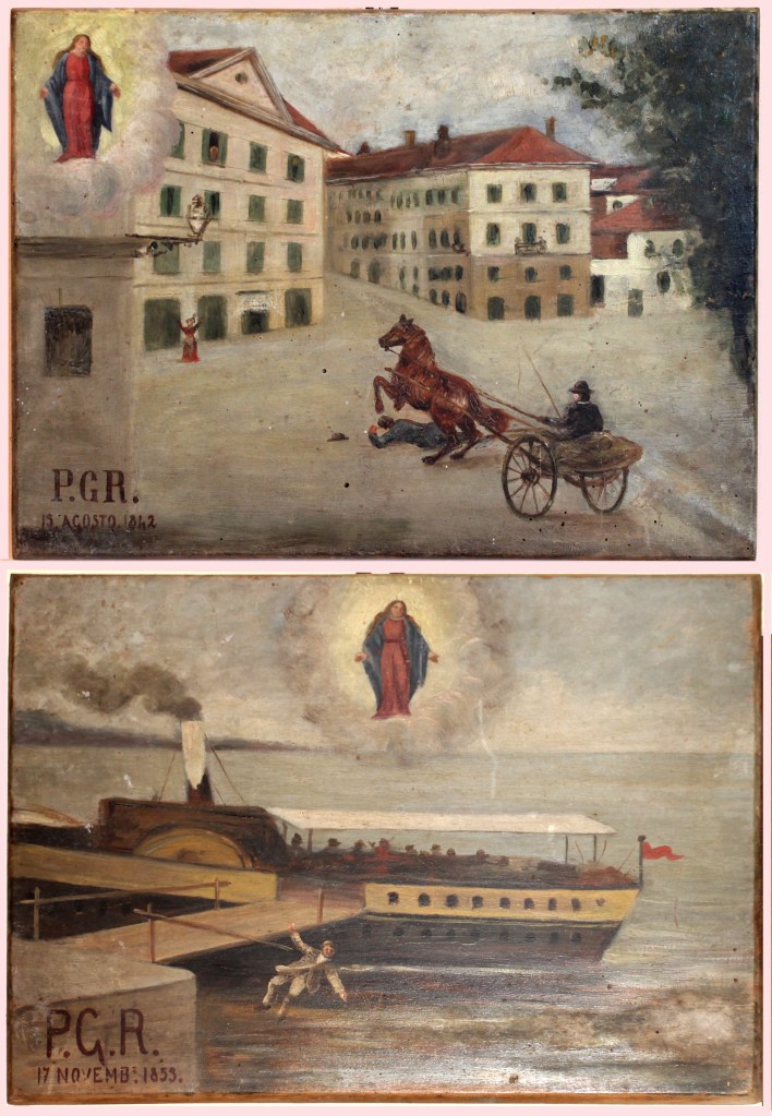 Comunque autorità religiose e civili, volenti o nolenti, la Madonna persevera nell’elargire miracoli. Nel 1842 salva un uomo investito da un cavallo imbizzarrito, nel 1853, miracolato un giovane che precipita in acqua mentre sta salendo su un traghetto. Cronaca degli eventi, tramandata da due ex voto sfuggiti alla spoliazione subita dall’oratorio quando “finalmente” come verga il parroco di Velate don Carlo Fantoni nel dicembre del 1957, passa alla parrocchia. Ritorniamo a metà Ottocento per ricordare come tra i due miracoli, nel 1846 Francesco Croce muore e lascia i suoi beni alle figlie Carolina e Giuseppina a cui affida i due oratori che erano stati di sua proprietà, a Carolina il Dosso a Giuseppina quello del Masciocco dedicato alla Madonna del Carmelo. Nonostante la vena miracolosa non si prosciughi, le due sorelle sono corrucciate, dalla semi-clandestinità in cui versa il loro oratorio. Ecco che mettono in atto un piano, o perlomeno i fatti che andiamo a raccontare così ci fanno ipotizzare.