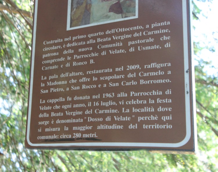 Il 16 luglio la Chiesa celebra la ricorrenza di “Nostra Signora del Monte Carmelo”, più semplicemente la Madonna del Carmelo, a cui ricordiamo è dedicato l’edificio religioso, a forma circolare, noto come “Oratorio del Dosso di Velate”. Edificato negli anni Venti dell’Ottocento dal nobile Francesco Croce, con il concorso dei contadini del luogo, grazie alle offerte raccolte per onorare una miracolosa Madonna, la cui immagine ornava l’unica parete superstite del diroccato antico Oratorio dedicato a San Giacomo. La nuova costruzione volle appunto inglobare al suo interno la Vergine che faceva miracoli. Una Madonna che aveva iniziato i suoi prodigi anni avanti. Il primo evento risaliva al 1686. La fama si era accresciuta nel corso di un secolo e mezzo, fino a quando, il citato Francesco Croce, proprietario del Masciocco della Valmora, così come del terreno su cui, nel 1822 si era edificato l’oratorio, chiede nel 1837 il permesso alla Curia per celebrare la messa, nel nuovo edificio.