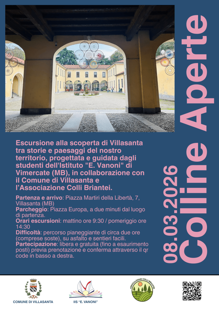 E’ in arrivo “Colline Aperte 2026“! Dalla collaborazione tra Comune di Villasanta, Istituto “Ezio Vanoni” di Vimercate e Associazione Colli Briantei torna l’iniziativa volta a promuovere tra i giovani la conoscenza del nostro territorio. La classe 3^D dell’indirizzo turismo dallo scorso novembre è impegnata a studiare il territorio di Villasanta e a progettare una visita guidata che verrà realizzata l’08 marzo prossimo.
